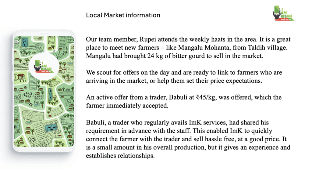 For some farmers, the market advisory service of providing daily market prices is a credible source to bargain and demand better prices for their produce from traders and FPCs. For others, it helps them understand market price trends across different markets. Sometimes, it is the change in the way in which they have been selling. Farmers like, Padmini Patra, Dakshina Majhi ( Kusumjodi village), Rama Soren (Baldiapal village) Singo Marandi (Gondriposhi), Daman Baskey (Rasol village) who call us and tell us that they would now like subscription for their current crop. It’s not just the subscription fees or sales commission these farmers give us, they give us confidence that there is value in our service. It also makes us more accountable and responsible to get the most credible and usable information for them. Over the last two years, farmers from the Narpunga area selling jackfruit through ImK is an example of their trust in our services. This was an instance, where linkages with newer traders helped farmers get paid basis weight rather than the prevailing payment on a per piece basis. This year we expanded the watermelon markets to West Bengal and were able to offer market linkages with larger traders for farmers like Pramod Mahanta, who were cultivating and dreaming bigger.