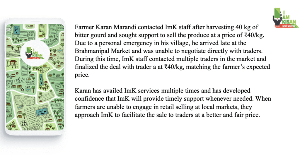 I am Kisan, our first offering, was launched in 2017. It was an offline mobile app to provide smallholder farmers curated information to supports their decision making. In 2018, we expanded to a wider range of information and created an online application. In 2025, we continue to provide credible and usable market information to small holder vegetable farmers that helps them in their decision making and helps reduce risk. Farmers pay for this information. They receive a daily SMS with market rate of their produce and a village level advisory. They also reach us to help sell, when needed. It is not a compulsion, it is to widen the possibilities for them. I am Kisan services continued with our slow and steady growing base of subscribers. We provided this service to 194 subscribers during this period. We visited 36 markets in the region this year, doing deals across 18 markets. We collect prices on a regular basis from seven markets in the region. We facilitated 265 deals and dealt with 44 traders. The promise of zero post-harvest loss to farmers for watermelon makes it a robust offering of I am Kisan. We are continuing work with jackfruit, pumpkin besides the vegetable crops of bitter gourd, tomato and chilly. We also gained some experience in tamarind and drumstick deals. In these deals, farmers speak with traders directly – we support them in connecting, negotiation and in closing the deal. It is not just that one sale that the farmer does with us. It is a comfort in knowing the market through having engaged with it profitably and with confidence. अपने बल पर