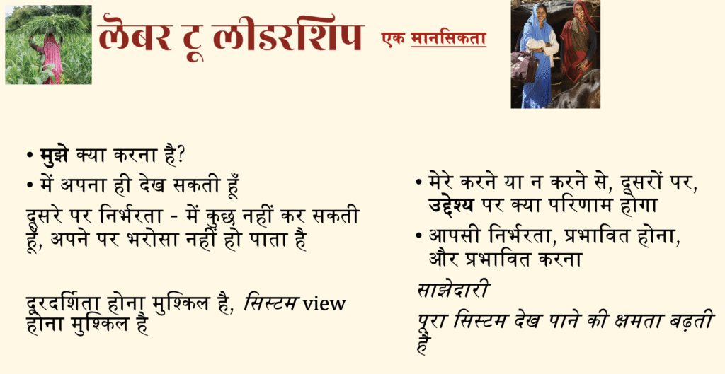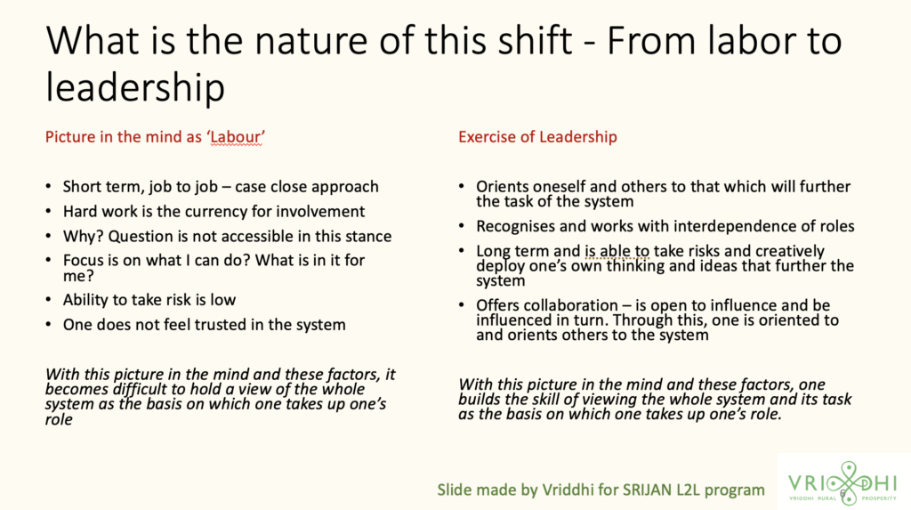 It was first offered in 2022-23 to four FPCs in collaboration with SRIJAN with Vartika and Asha as consultants. This program started as most things do – a labor of our love and what felt in the moment as a setback! SRIJAN provided a nest for this work and continued to engage with the results as they came. We later partnered in Rajasthan (via Ibtada) and with Collectives for Integrated Livelihood Initiatives in Odisha. It is an initiative focussed on changing the place of women in agriculture, by augmenting their ability to run robust and profitable agribusiness companies. There were insights for each FPC and for promoters on what this shift of labor to leadership would mean and what it would take to sustain this. One can say, that labor to leadership is a kind of organisation development exercise of promoters with their FPCs.